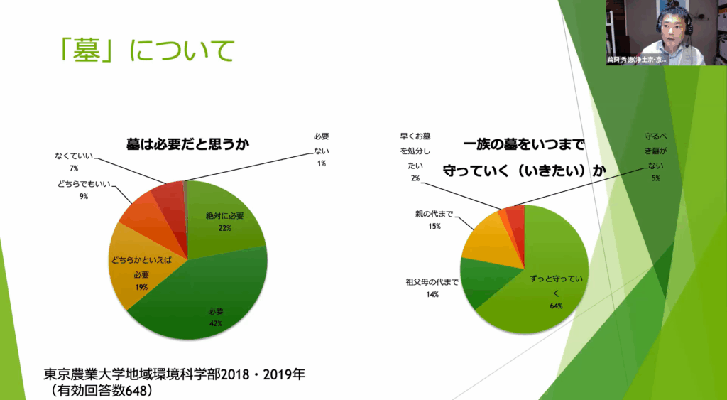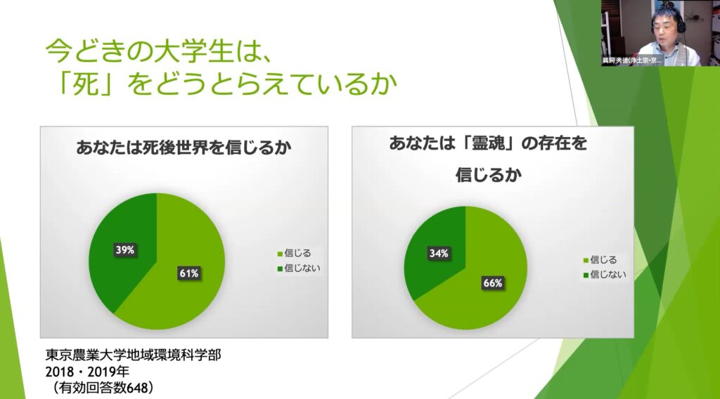 最後に、ジャーナリストで浄土宗僧侶である鵜飼秀徳さんから、2つの大学で死生学を教えてこられた経験から、いまの若い学生たちが死をどのようにとらえているのかを発表しました。