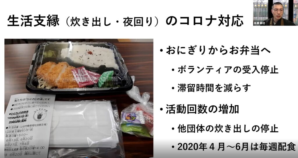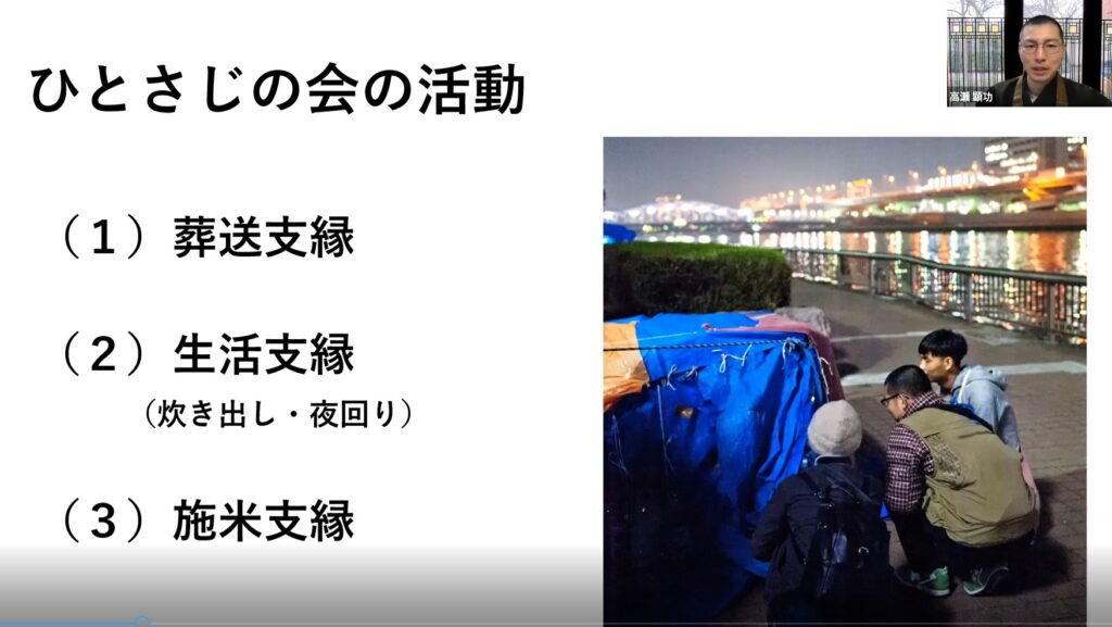 今回のZoom安居では、路上生活者におにぎりを配る活動を続けてこられた「ひとさじの会(正式名称:社会慈業委員会)」の代表 髙瀨顕功さんと、お寺にお供えされるさまざまなおそなえを、仏さまからの「おさがり」として頂戴し、子どもをサポートする支援団体の協力のもと、経済的に困難な状況にあるご家庭へ「おすそわけ」する活動を続ける「おてらおやつクラブ」の松島靖朗さんのおふたりに、日々の活動で感じられていることや、活動に携わられたきっかけをおうかがいしました。
