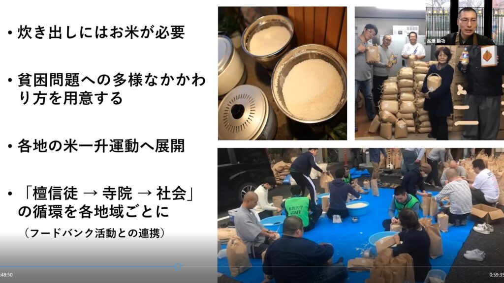 都市部以外では路上生活者がみられない地域もありますが、「近くにはそういう人たちがいないから関係ない」と済ませるのではなく、全国のお寺にこの問題を考えていただくための縁をつくろうと、(3)の「施米活動」(お米を全国のお寺から集める活動)を始めました。