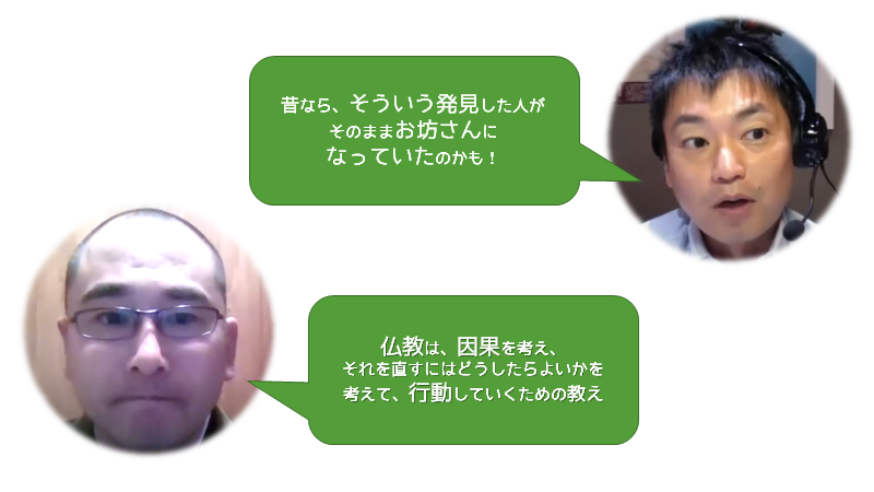 本日のゲストのおふたりや、Zoom安居にいらしてくださっている僧侶の皆さまは、社会貢献活動を通して「苦」に向きあわれ、仏教的にそれを解く方法を日々模索されていると思います。