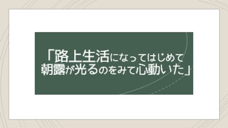 余っているから施すという上下関係ではなく、困窮しているかたから学ぶことがあるはずです。彼らは経済的貧困に陥っているかもしれないけれど、日常生活に追われ、朝露に心動くこともないまま、大自然の大いなる循環のなか生かされていることに気づかず年老いてゆくわれわれは逆に、「こころの貧困」に陥っているのではないでしょうか。