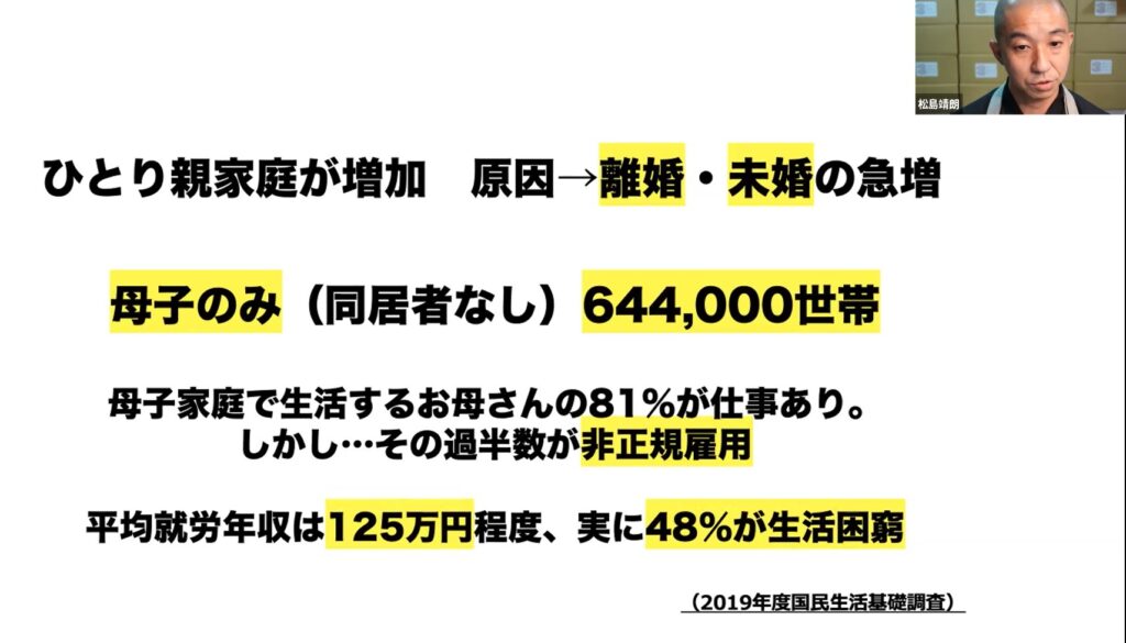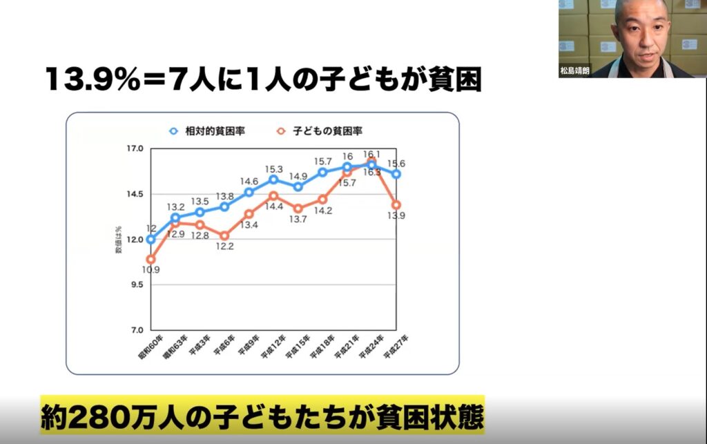 数字を見ていただけば明確ですが、ひとり親家庭の48%が生活困窮に陥っており、約280万人の子どもたちが貧困状態にあります。そして昨今、「7人に1人の子どもが貧困状態」としばしばニュースで報じられているにもかかわらず、多くの人は「そんなに多いはずがない」と感じています。