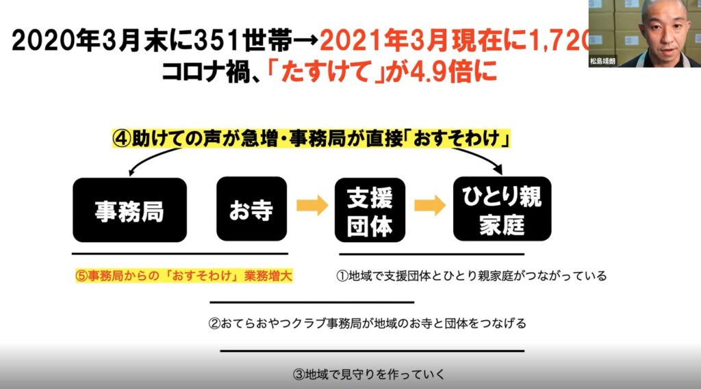 お寺にはあるのに、社会にない。ならば、それをつなげよう。――こうして、松島さんは「おてらおやつクラブ」を始めました。大きなきっかけとなったのは、8年前に28歳のお母さんと息子さんが餓死状態で発見された大阪の事件報道でした。